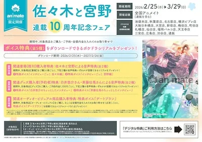 At the ``Sasaki and Miyano'' 10th Anniversary Fair, those who purchase or reserve products related to ``Sasaki and Miyano'' or ``Hirano and Kagiura'' will receive a ``Pokedra Serial'' that allows you to download voice benefits corresponding to each product. Yusuke Shirai will play the role of Hideaki Sasaki, and Soma Saito will play the role of Yumi Miyano. There are 6 types of voices, ``Interview Pretend Sasaki Edition/Miyano Edition'' is a newly written scenario by Haruzono, and ``A Short Interview with Yusuke Shirai and Soma Saito'' is a newly recorded one.