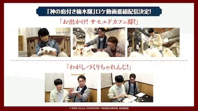 From April 6th to May 5th, Samoyed Cafe Moffu's Harajuku and Shinsaibashi stores will be holding a collaboration project with the Kusunoki residence with a divine garden. During the event, announcements by Shogo Sakata, who plays Minato Kusunoki, will be played in the store. In addition, the KADOKAWAanime channel will stream a location program starring Sakata and other cast members. The ``Outing! Samoyed Cafe House'' episode, where you will visit Samoyed Cafe moffu, will be released in early April, and the ``Wagashi-zukuri Challenge!'' session, in which you will try your hand at making Japanese sweets, will be released in late April.