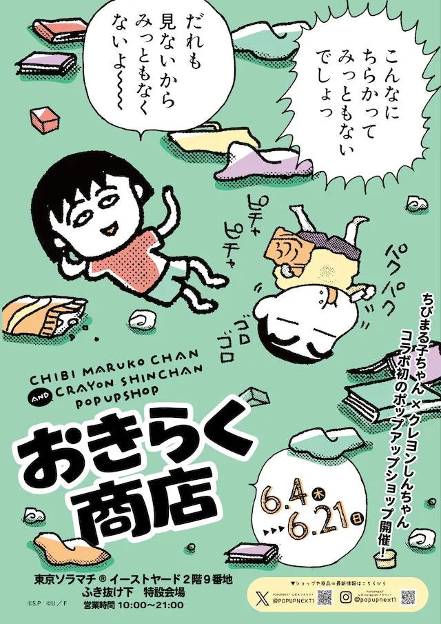 The limited-time shop "Chibi Maruko-chan and Crayon Shin-chan POP UP SHOP Okiraku Shoten" selling collaboration products between Momoko Sakura's "Chibi Maruko-chan" and Yoshito Usui's "Crayon Shin-chan" will be available at Tokyo Solamachi from June 4th to 21st.