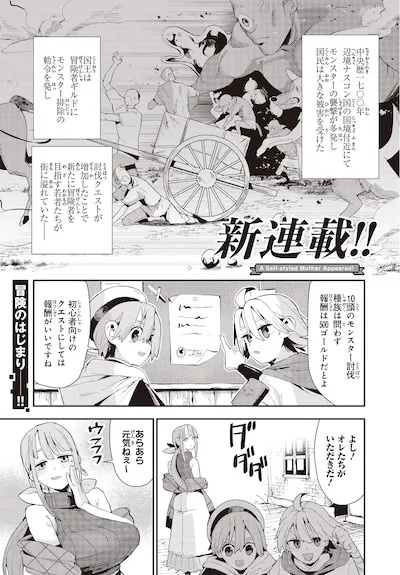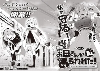 ``A self-proclaimed mother has appeared!'' is a fantasy work in which Aly and Kazam, young boys who have just become adventurers, are stalked by a mysterious beauty who claims to be their mother. Worried about Ali and Kazam as they go into the forest, the "mother" follows them, and when they are in a pinch, she bravely saves them, sells them, and considers taking them home and making them her own. What will be the fate of the two, who are targeted by a "mother" who is in some ways more dangerous than a monster?