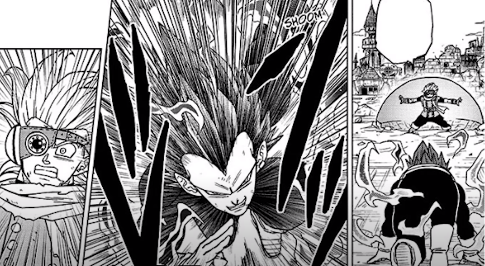 Vegeta was still in the loser’s seat but was clearly becoming more and more of an annoyance to granola even managing to goad him into accidentally causing the further destruction of his former home and at that Vegeta would conclude and convey that granola is not yet used to his newfound power as he is seriously lacking in battle experience comparatively and from there granola was still in the lead but the tide was indeed shifting slowly but surely and as he fight raged on Vegeta only continued to become stronger and stronger and in recognizing this granola sought to finish him off and delivered a major blow to a vital point of Vegeta’s which was barely held back yet even still the damage was severe but strangely enough Vegeta was clearly enjoying himself here rather than having to be a hero in this fight he was simply able to be a battle craze warrior just as his genetics intended and suddenly a wellspring of unsettling godly Ki would exude from his body from which he would emerge a changed man this was a brand new transformation we had never seen before an unbounded instinctual power he had unlocked thanks to his training with the god of destruction Beerus and we would pick up right from there with this latest chapter as Vegeta would unfurl his arms and release this ominous power in the direction of a clearly disturbed granola it would take him a second but he would actually manage to disperse he power before him just as the presence of Vegeta would suddenly take its place now gripping tightly onto granola scarf and looking him right in the face Vegeta would say that granola’s gotten a bit too full of himself and fully intended to knock him down a peck or two and granola was shook as.