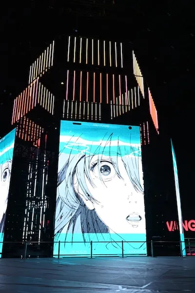 "EVA EXTRA 30" is centered around the central tower, which is the core of the "spatial concept" that can only be experienced at this event. Images, logos, and Evangelion motifs from each work in the series are projected one after another on six large LED monitors that form the central tower, accompanied by solemn background music. The countless LED bar lights placed throughout the area also change color to match the images, creating a majestic atmosphere in the space. After the doors opened, many visitors stopped in front of the monitors and watched the images.