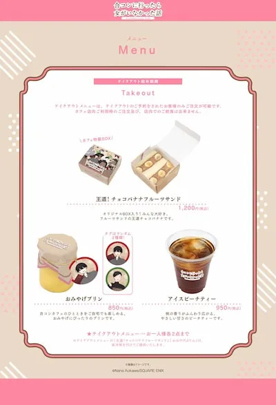 There are eight types of drinks in the lineup, including one inspired by the cocktail that Fuji bought Asagi as an apology, and rose hip tea named after the men's bar Rose. In addition, you can take out the chocolate banana fruit sandwich in the cafe's special box, pudding with either Soho or Tokiwa tags, and iced peach tea.