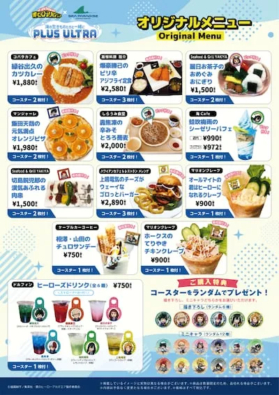Collaboration food and drinks will also be available. Food items inspired by Izuku Midoriya, Katsuki Bakugou, Shoto Todoroki, and Ochako Uraraka are available, including ``Hawks' Teriyaki Chicken Crepe.'' Furthermore, when you order a collaboration drink, a straw marker and coaster with character illustrations will be included.