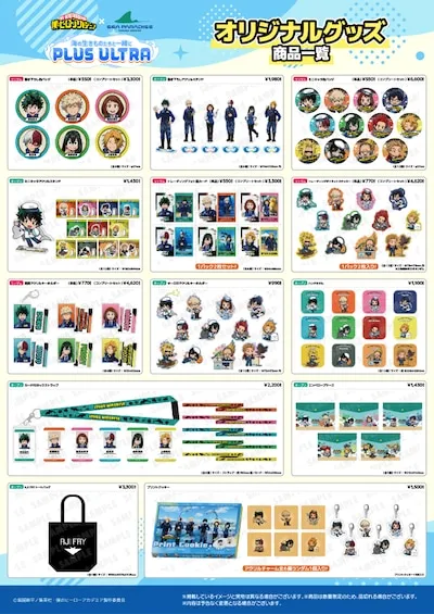 The visual drawn for the collaboration features Izuku Midoriya, Katsuki Bakugou, Shoto Todoroki, Denki Kaminari, Ochako Uraraka, and Tsuyu Kaburubuki wearing Yokohama Hakkeijima Sea Paradise staff costumes. Dolphins are jumping around in the background. Goods using these newly drawn illustrations and mini character illustrations are also sold inside the facility. The lineup included acrylic stands and printed cookies. Furthermore, those who purchase over 2,000 yen including tax will receive an illustration card as a purchase bonus.