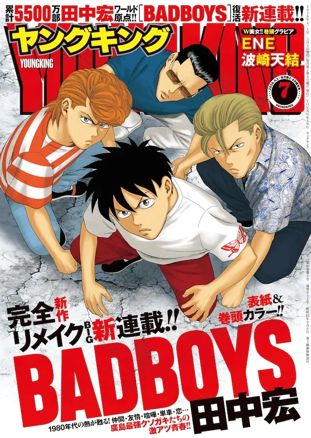 Hiroshi Tanaka's ``BADBOYS'' started as a ``revival new series'' in Young King No. 7 (Shonen Gahosha) released today, March 9th. Decorating the cover and front page colors.
