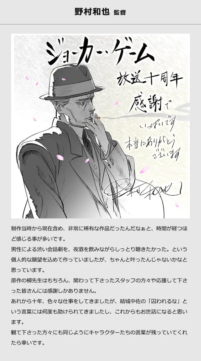 The TV anime "Joker Game" celebrated its 10th anniversary on April 5th, and comments and illustrations from the original author Koji Yanagi, director Kazuya Nomura, series composition and screenplay Taku Kishimoto, original character designer Shiro Miwa, character designer Toshiyuki Yahagi, and Yuki actor Keno Horiuchi were released.