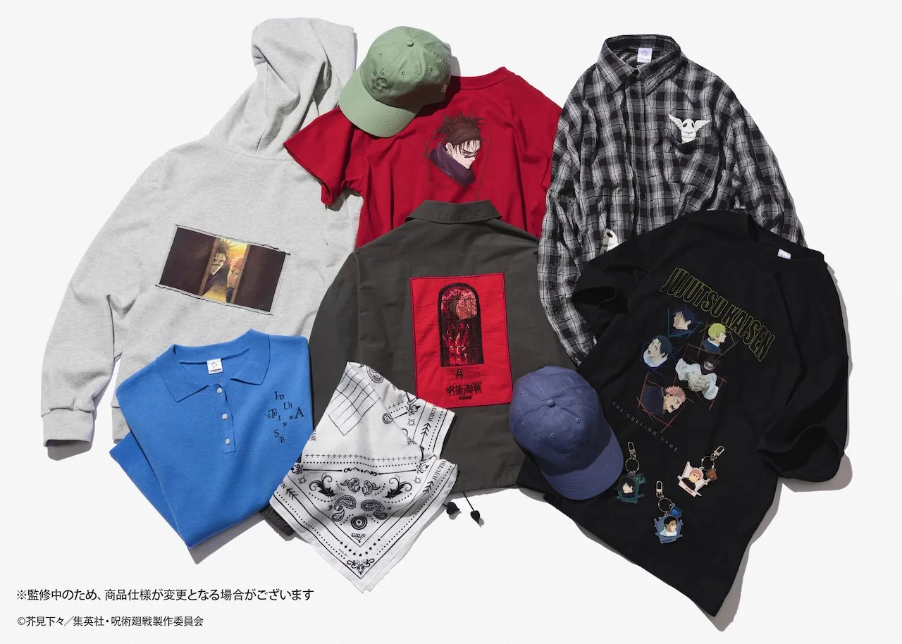 A total of 8 types of collaboration items are available, including fashion items and goods sets with motifs of Yuhito Kojo, Megumi Fushiguro, Yuta Otsukotsu, Ensou, Naoya Zein, and Kogane. T-shirts that incorporate the image colors of each character, coach jackets embroidered with the super teaser visual for "Shimetsu Kaiyu", and hoodies printed with scene cuts such as the scene in which Yuji Kojo and Enso look into the mortuary and the scene where they depart for Shimetsu Kaiyu are available. The acrylic key hanger also incorporates a "window lattice" design reminiscent of the super teaser visual. The original logo of this collaboration was used on some items.