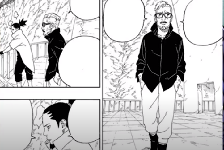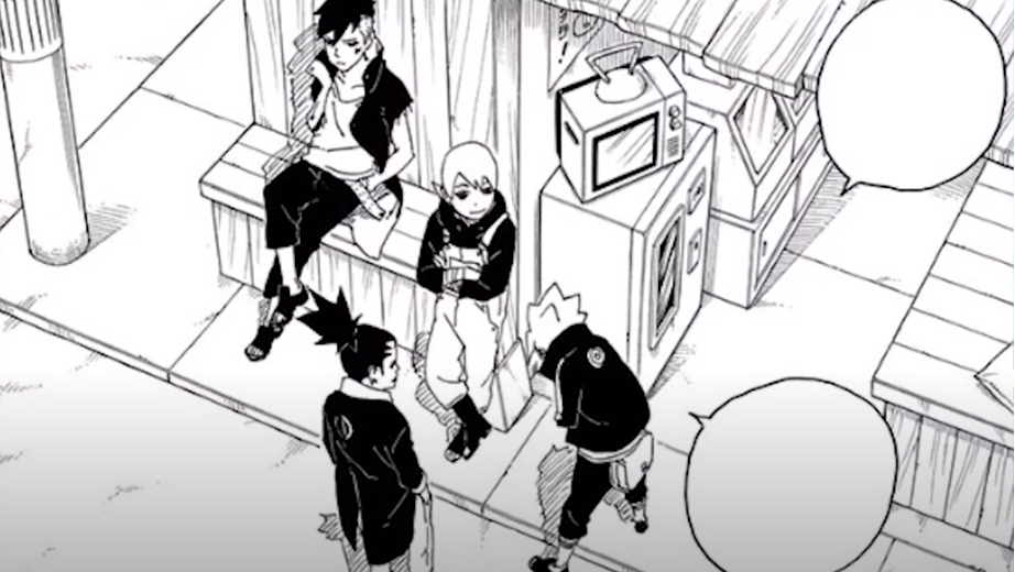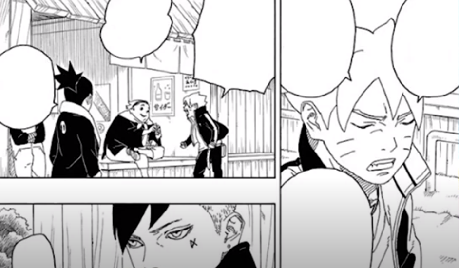 The chapter opens with daily life in Konoha we have Boruto Shikadai and Inojin opening packs of trading cards Boruto was hoping to pull sasuke from his pack but ended up getting Shino and let’s just say that well he wasn’t pleased Kawaki a little off to the side would take notice of something it was again like the previous chapters someone keeping an eye on him not for a lack of trust but for his own safety this security wasn’t really making an attempt to hide merely standing out in the open with an eye on them Shikadai would be the voice of reason reminding the others that they have no clue when or where the enemy will attack and is thanks to this security that they’re able to live carefree and do things like play with trading cards a valid point and it’s often chicken eye that keeps the others thinking rationally there are times when it’s Boruto playing this role but Shikadai is the reliable character when it comes to rationality in response to this reminder Boruto with an annoyed expression would agree but admit that being watched like this 24 7 is starting to stress him out Kawaki would quickly counter that though saying that Boruto has been sleeping like a baby every night this would trigger Boruto a bit but it would be soon calmed down they would begin talking about Konoha’s sensory net something Kawaki had previously not heard of Inojin would explain that it’s a barrier around the village that automatically checks everyone coming in and out of Konoha it would be explained further that chakra are like fingerprints no two are identical what the net does is compare chakra against the database to decide if the individual is known or not in addition to that the sensor can detect if a newcomer is an enemy like we saw with delta and Ishiki it’s pretty crazy that something like this is possible but it shows how core chakra is to each individual Boruto would argue that it was because of this surveillance was unnecessary this next part is funny because Inojin would point out that the system doesn’t track each individual all the time only when they enter anything else would be a violation of privacy even Boruto’s world has privacy concerns.