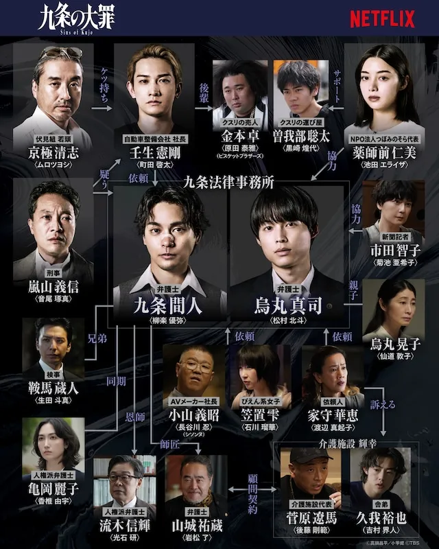 ``Kujo's Deadly Sin'' is a crime entertainment story centered around Kujo, who is known as an unscrupulous lawyer who only takes on troublesome clients such as semi-grabbers and ex-convicts, and Karasuma, an elite lawyer who comes to work at his office. All 10 episodes will be released on Netflix on April 2nd. In the relationship diagram, various characters are connected like a web, centering on the main character, lawyer Masato Kujo, played by Yuya Yagira, and ranging from the legal world to residents of the underworld, including a detective, a young head of a gang, the president of an AV manufacturer, a representative of a non-profit organization, and a newspaper reporter.