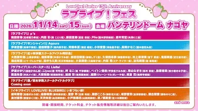 The live event "LoveLive! Series 15th Anniversary Love Live! Festival" commemorating the 15th anniversary of the "Love Live!" series will be held for two days on November 14th and 15th at Vantelin Dome Nagoya in Aichi.