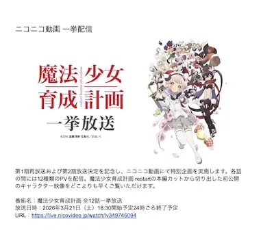 The broadcasting date of the TV anime "Magical Girl Raising Plan restart" has been decided in the fall of 2026. It was also announced that the first season of the anime ``Magical Girl Raising Project'' will be rebroadcast on TV Tokyo and BS Fuji from April.