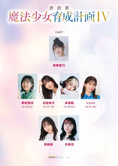 In addition, it has been decided that the latest reading play ``Magical Girl Raising Plan IV'' based on the original work by Asagi Endo will be performed at Sogetsu Hall in Tokyo for a total of 4 performances on June 20th and 21st. Yoshino Nanjo will play the lead role as Pufure, just like in the anime, and Ai Kayano, Yoko Hikasa, Kaede Hondo, Lynn, Hime Sawada, and Yuka Hiiragi will also appear. Applications for advance ticket lottery will start on LivePocket at 12 noon on March 21st. For details such as the performance dates of each cast, please check the official website of the reading play.