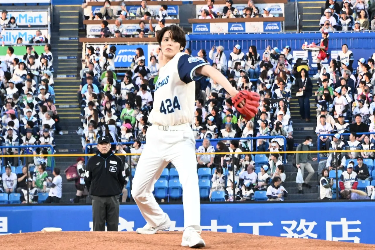 Mamoru Miyano pitched the first pitch of the night game between the Tokyo Yakult Swallows and the Yomiuri Giants held at Meiji Jingu Baseball Stadium in Tokyo on April 18th.