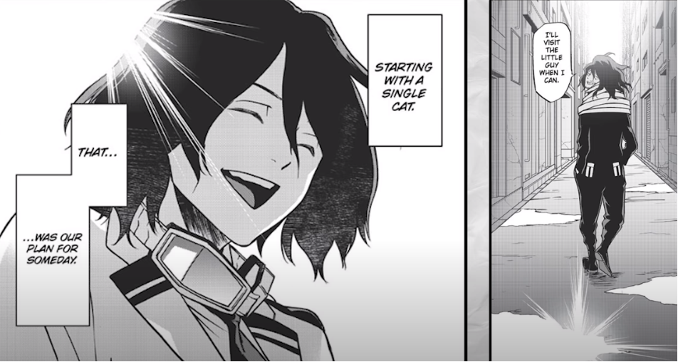 We know today above all else he’d become more serious more distant his grades at U.A. remained above average and his skills had come a long way from the start of his time at the school he would however begin to only show interest in practical battle exercises his teachers described it by saying that he’d become complacent in a weird way it was at this time we would learn that his sleeping habits were a result of solo training during all hours of the night sometimes a due gym and other times outside of school. while for Yamada while he was coping also he went about it in a different way when the time came to discuss career aspirations at U.A. as our listed starting his own agency as his aspiration something unusual because U.A. students often work a few years under already established heroes for experience to this point as I responded that he’ll only specialize in anti-villain combat so he could focus only on fighting and nothing else and also making it clear that he’s meant to be an underground independent pro hero post-graduation, Aizawa would do exactly what he planned go independent and be an underground hero from the page of various moments we can gather that not only was he independent but he was homeless and living out of a suitcase at least at a certain point it was sometime after this that he would meet the crawler and the rest of the vigilante cast it’s hard to tell what exactly was going through Aizawa mind at this time or even if he was content with his life but at the very least we know.