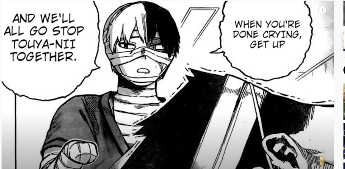 Endeavor would be able to fight anymore at first and that he would have to handle the situation by his lonesome but after talking to his mother prior and being here for this conversation that doesn’t seem to be the case that instead when his father is done crying they can all go stop, Toya together as he would extend a hand with the chapter then closing with hawks and best genius right outside the door this was phenomenal horikoshi has managed to take me from indifferent and or disinterested to fully invested things didn’t have to be this way there were so many opportunities for change and or recovery but in the end things are the way they are and i cannot wait to see where this all goes there is still the matter of dealing with the public and all that but wow great chapter Toya definitely lost his sanity at a certain point but at the end of the day he was a kid in a toxic environment the blame befalls appearance more than anyone else and certainly his decisions as an adult are a different story entirely but I’m sorry i cannot get behind that weirdo mentality of blaming a little kid for being broken by tragic circumstances.