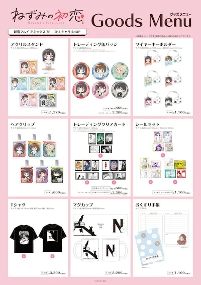 The ``Nezumi's First Love POP UP SHOP'' sells acrylic stands featuring Nezumi and Ao, T-shirts featuring scenes from the story, and trading clear cards with color illustrations. We also have a lineup of sticker sets, mugs, and medicine notebooks. Deformed character hair clips and trading badges also appeared.