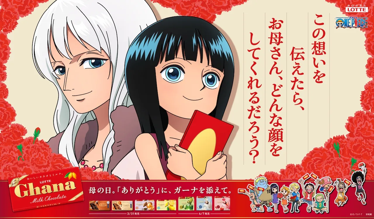 尾田栄一郎原作によるTVアニメ「ONE PIECE」とロッテの「ガーナチョコレート」が再びコラボレート。 The campaign will start today, March 24th, in preparation for Mother's Day on May 10th and Father's Day on June 21st.