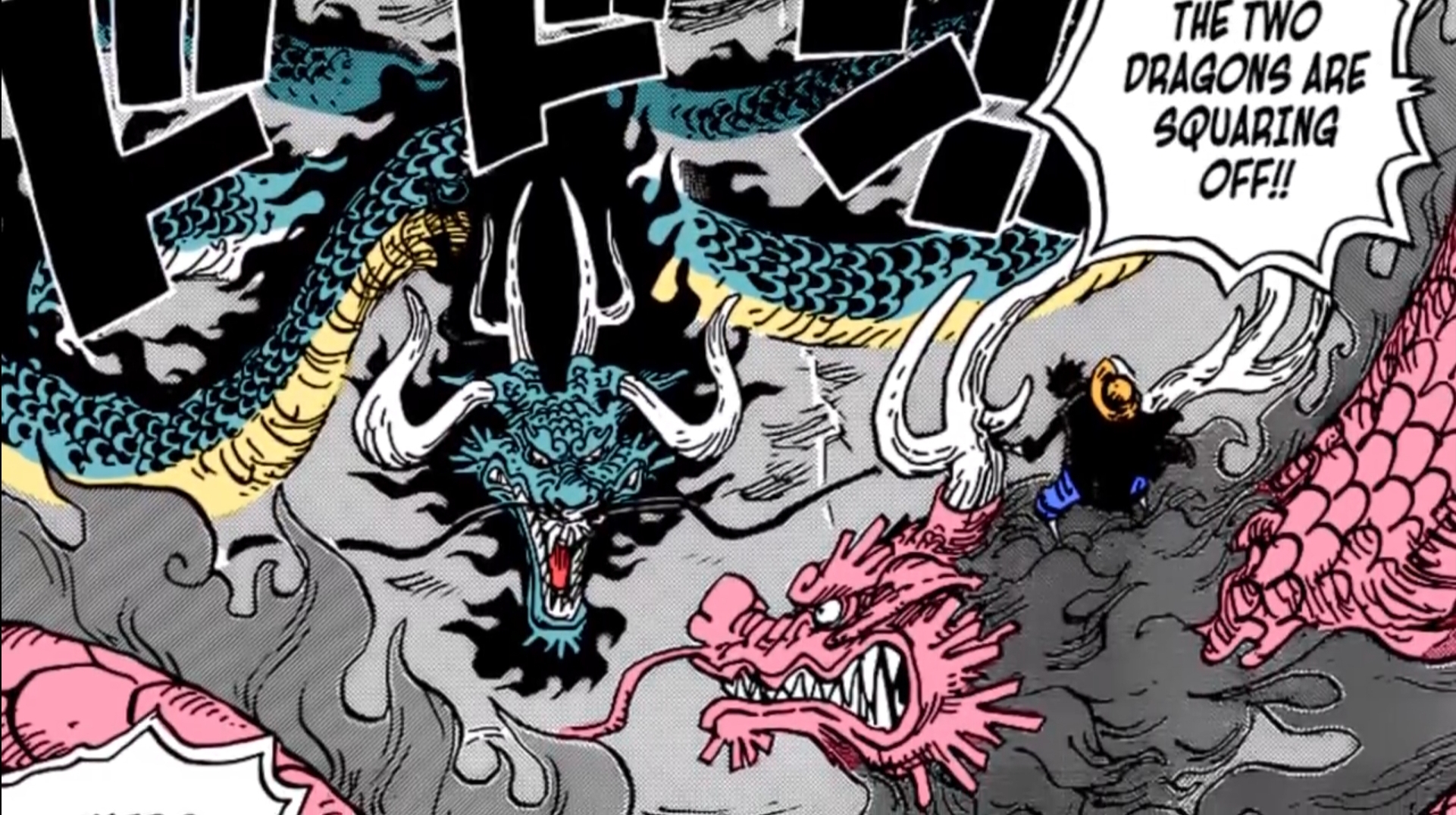 I’m hoping we get some more and much needed Kaido characterization soon that will help shed light on how exactly he views Yamato and her importance to him we see Luffy riding a dragon again and i made a point out of how hyped that was last time as well and here we have it being emphasized verbally as it stated that the pink dragon is challenging the azure dragon and is being ridden by straw hat Luffy it’s like when the cursed dragon fused with Gaia the fierce knight to create Gaia the dragon champion in other words for the weeb very hype indeed Yamato is still there putting together all the evidence and remembering that Momo wished he could turn into a monster like Kaido’s dragon form as they keep saying can’t wait for Momo to turn into his human or even hybrid form and for Yamato to see the Odin resemblance that reaction of Odin’s number one fan will no doubt be priceless queen quickly realizes that Yamato must have been keeping Kaido busy and that there’s no doubt this dragon is hostile towards them and i just love how hilarious Luffy is here his conversations with Momo are the best.