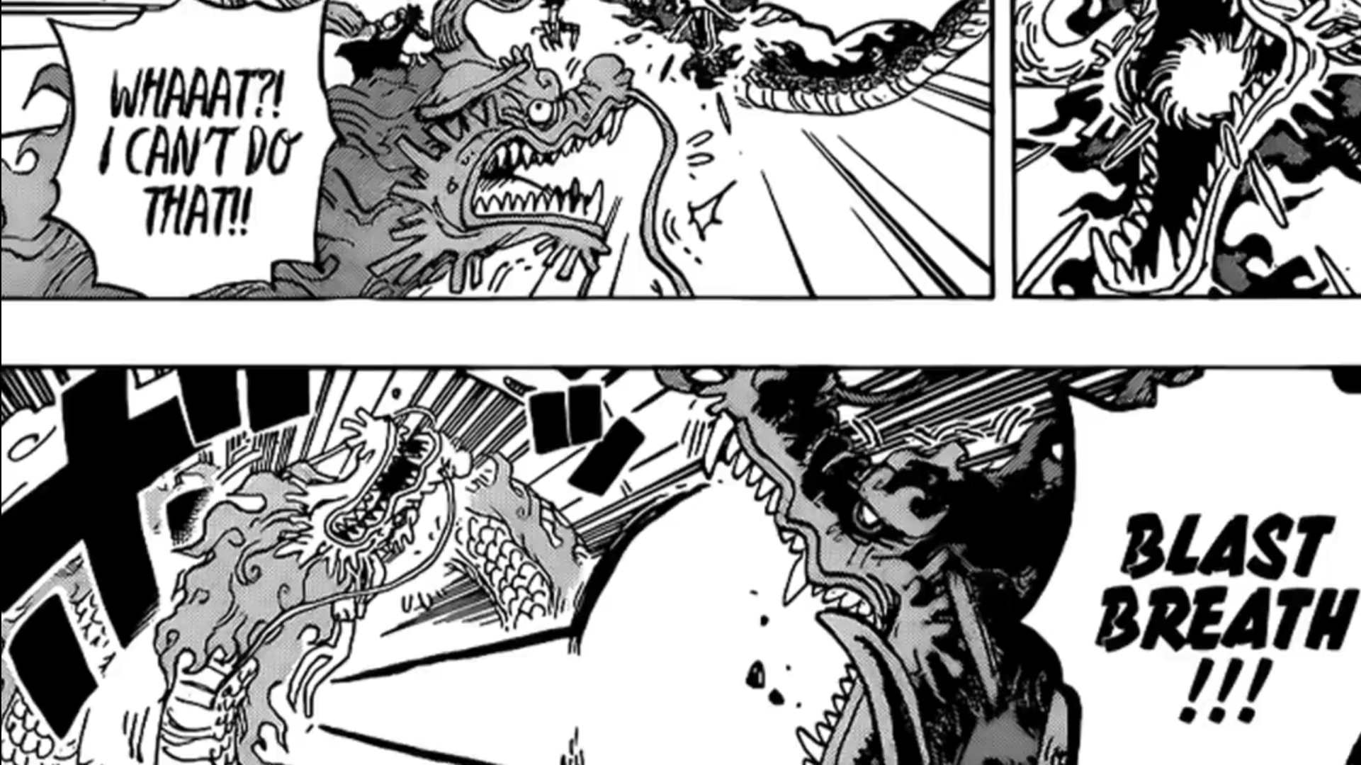 Kaido is about to launch his famous blast breath a Yanko’s blast breath and Luffy is just like alright Momo counter it with your own breath oh my god it’s so funny Momo is just like there’s no way i could do that bro but to his credit he does appear to dodge the attack which is honestly just as good he tells Luffy again to remember that he’s in no position to fight right now remember he’s still mentally a kid and he’s facing off against a Yonko so his nervous sweats are totally justified Luffy jumps off the dragon and with an elephant gun smashes Kaido’s giant dragon into the ground i know it usually leaves no lasting damage on Kaido but visually i just love seeing Luffy’s tiny figure by comparison punch around something as big as Kaido’s dragon we then see that Luffy randomly asked Momo to bite Kaido i love how straightforward our future pirate king is obviously Momo is hesitant and to himself feels like there’s no way he can do it he does have some puts after all he remembers the burning castle him screaming out for his mother Kaido lifting his powerless crying self up and threatening his life but you know Momo is the man so he pushes through and actually bites hard into Kaido using the memory of when Kaido called his father a fool as motivation as usual with Oda at first it seems like it might have done some damage but then Kaido calmly looks over and asks what are you doing brat it’s as if he’s responding to an annoying fly and nothing else Momo thinks about how Kaido ruined Wano how his parents would be alive if not for Kaido and then the bite evidently served its purpose as Luffy comes in with another powerful punch sending Kaido flying it makes my heart smile when Luffy says nice going Momo because i know how much those few words must mean to our future shogun we then jump to some other fights and they may not be the main attraction but boy do they take an interesting turn it doesn’t look good initially for invades and Nekomamushi it’s mentioned that we’ve seen the last of the moon tonight since dragons call forth storm clouds it’s unlikely with two dragons that it’ll show itself again without their Sulong forms jack thinks he will beat Inu Arashi and Perospero thinks he will beat Nekomamushi it’s as good as done in their opinions jack even says one more hit and he probably would have been done Perospero similarly knows how lucky he is about the moon and simply says Nekomamushi will lose because of his bad luck as Nekomamushi and Inu Arashi look like they’re on the verge of utter defeat we jump back to Luffy who proclaims that Momo just bit one of the four emperors and asks after doing that does anything in the world still seem scary to you.