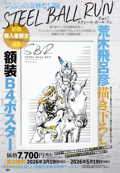 Also, in the same issue, Hirohiko Araki's ``The JOJOLands'' appears on the cover. In the magazine, a ``Frame B4 poster of ``JoJo's Bizarre Adventure Part 7 Steel Ball Run'' drawn by Hirohiko Araki will be available for mail order only to first edition purchasers.