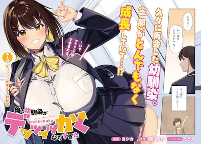 Yoshika's ``My childhood friend has become too big'' is a comic adaptation of Yoshino Orikuchi's novel. Touji, now a high school student, reunites with his childhood friend Riris. Her breasts have grown to an incredible size, and she seems to be constantly worrying about them. Ririsa asks Toji to be my bodyguard.