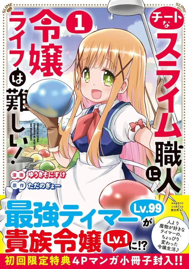 Volume 1 of Yuki Sonisuke's ``Life as a young lady is difficult for a cheating slime craftsman!'' was released by Takeshobo today, April 7th. This is a comic adaptation based on a novel written by Tadano Gyo.