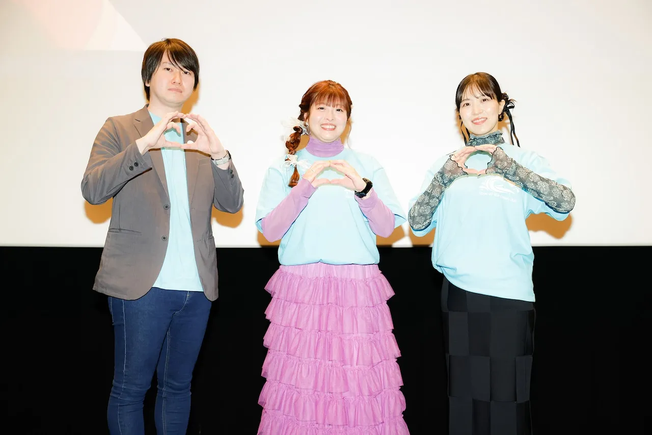 Special talk show commemorating the release of ``That Time I Got Reincarnated as a Slime the Movie: Tears of the Blue Sea''. From left: Producer Shinichiro Narita, Asuna Tomari who plays Gobuta, and Saori Onishi who plays Yura