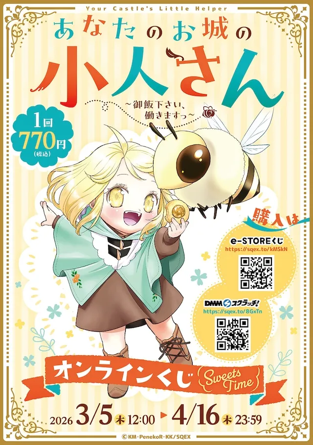 The online lottery for Kazumi Kurihara's ``The Dwarf in Your Castle ~Give me some food, I'll work~'' based on the original work by Kazuhito Mifukuro is now available on e-STORE and DMM Scratch. Reservations are being accepted starting today, March 5th. The price is 770 yen including tax.